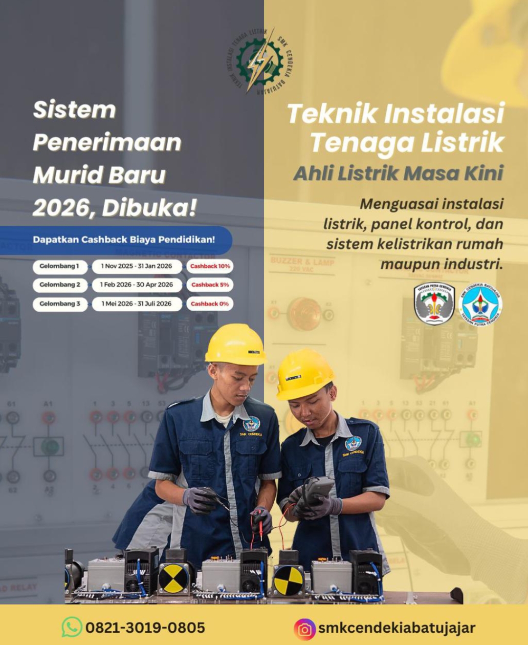 Mau punya skill yang gak bakal mati dimakan zaman? Join ke jurusan Teknik Instalasi Tenaga Listrik (TITL) di SMK Cendekia Batujajar! Di sini kamu gak cuma belajar pasang kabel, tapi bakal kuasai panel kontrol sampai sistem kelistrikan industri yang super canggih.